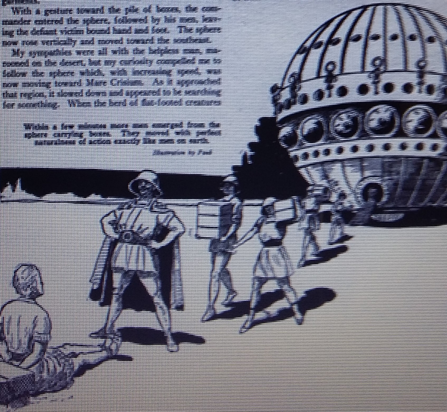 ...My first vision of the surface of the moon with the most powerful eyepiece showed an almost level plain, free from both vegetation and sand. No evidence of even the slightest atmosphere was found, and I was inclined to think father was joking when he said life was possible on the surface of the moon. I moved the lens toward the circular ring of mountains and the smooth level appearance of the surface was broken by small craters, many of which did not seem to be more than a foot or two in diameter. Their height in most cases was greater than their diameter. The surface became more uneven as the lower slopes of the mountains came into view. I could now distinguish a form of brown, grassy vegetation. A few minutes later I discovered a small spring of water at the head of a short stream, which ended by soaking into the land and silt...