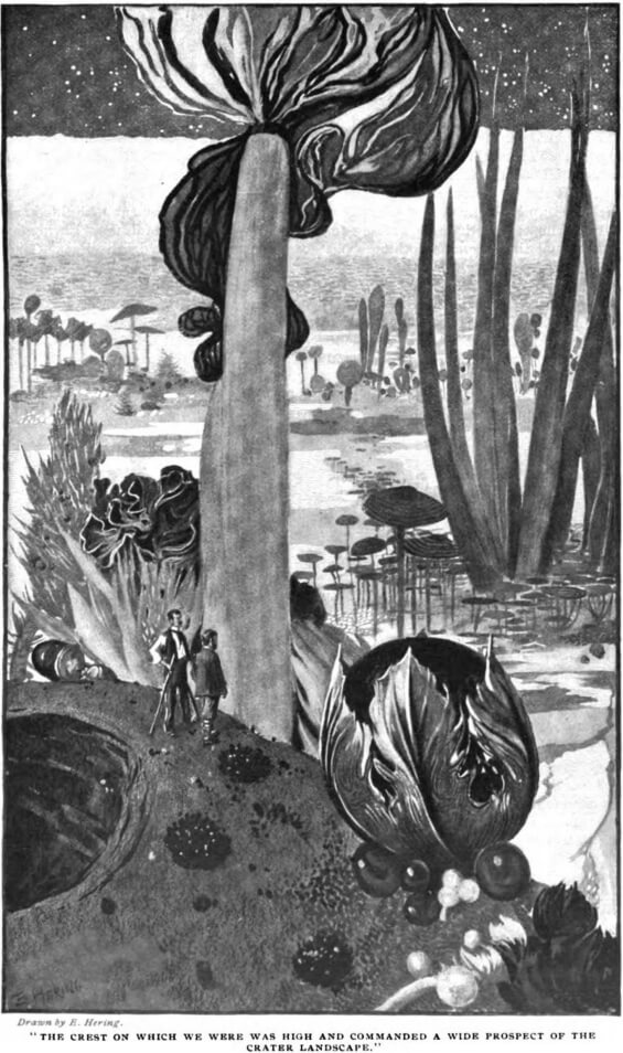 Stid: Not quite. Admittedly in The First Men in the Moon there is plant life, and some thin air, but the plants die and the air freezes solid during the lunar night. The ecology is somewhat tenuous, and very pale, so as to be plausibly invisible to telescopic observers on Earth. Wells just about gets away with it, but he wouldn't have if he'd tried to set the main part of the plot on the lunar surface. Most of the action and the discoveries take place underground. And you're always going to get that downward pull, to caves and caverns and (in The Moon Maid) to an entire hollowed-out Lunar Pellucidar, as authors strive to evade the impossible task of portraying convincing lunar surface life.