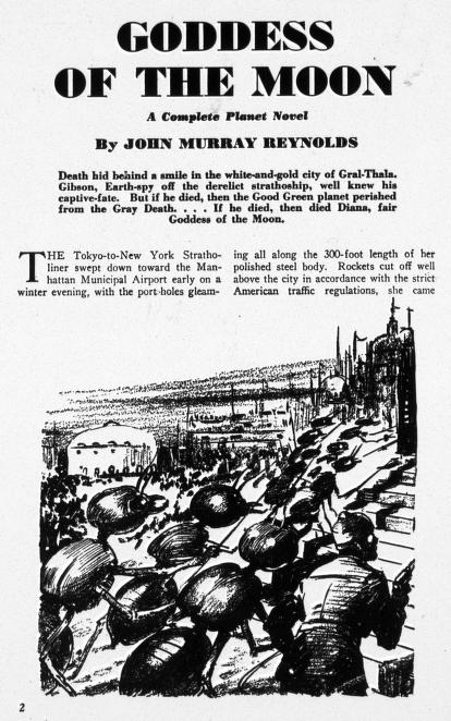 Edgar Rice Burroughs, The Moon Maid (1922); E R Eddison, The Worm Ouroboros (1922); Myer Krukfeld, "The Lunar Pit" (Thrilling Wonder Stories, June 1940); Murray Leinster, "Keyhole" (Thrilling Wonder Stories, December 1951); Hugh Lofting, Dr Dolittle in the Moon (1929); John Murray Reynolds, "Goddess of the Moon" (Planet Stories, Spring 1940)