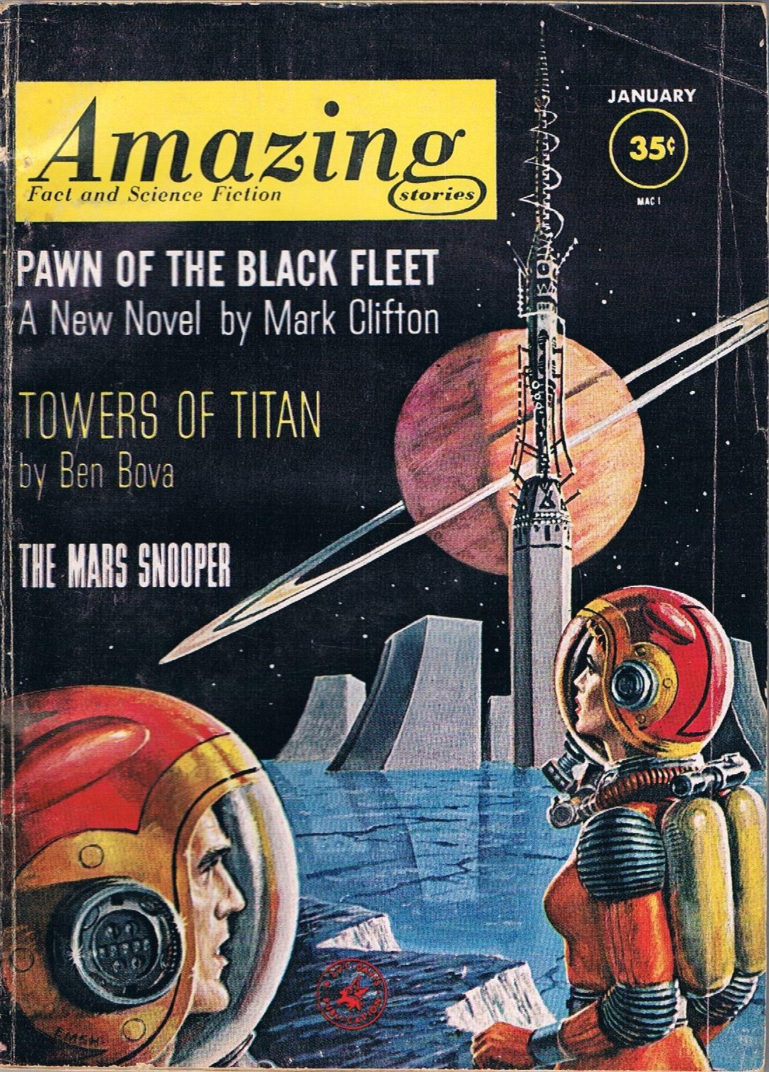 Arthur K Barnes, "Trouble on Titan" (Thrilling Wonder Stories, February 1941); James Blish, "How Beautiful With Banners" (1966, commissioned for Orbit 1, ed. Damon Knight; also reprinted in the Blish collection, Anywhen (1971)); Nelson S Bond, "Wanderers of the Wolf Moon" (Planet Stories, Spring 1944); Ben Bova, "The Towers of Titan" (Amazing Stories, January 1962); Arthur C Clarke, Imperial Earth (1975, 1976); Philip K Dick, The Game Players of Titan (1963); Edmond Hamilton, "The Harpers of Titan" (Startling Stories, September 1950); Robert A Heinlein, The Puppet Masters (1951); Kurt Vonnegut, The Sirens of Titan (1959); Stanley G Weinbaum, "Flight on Titan" (Astounding Stories, January 1935)